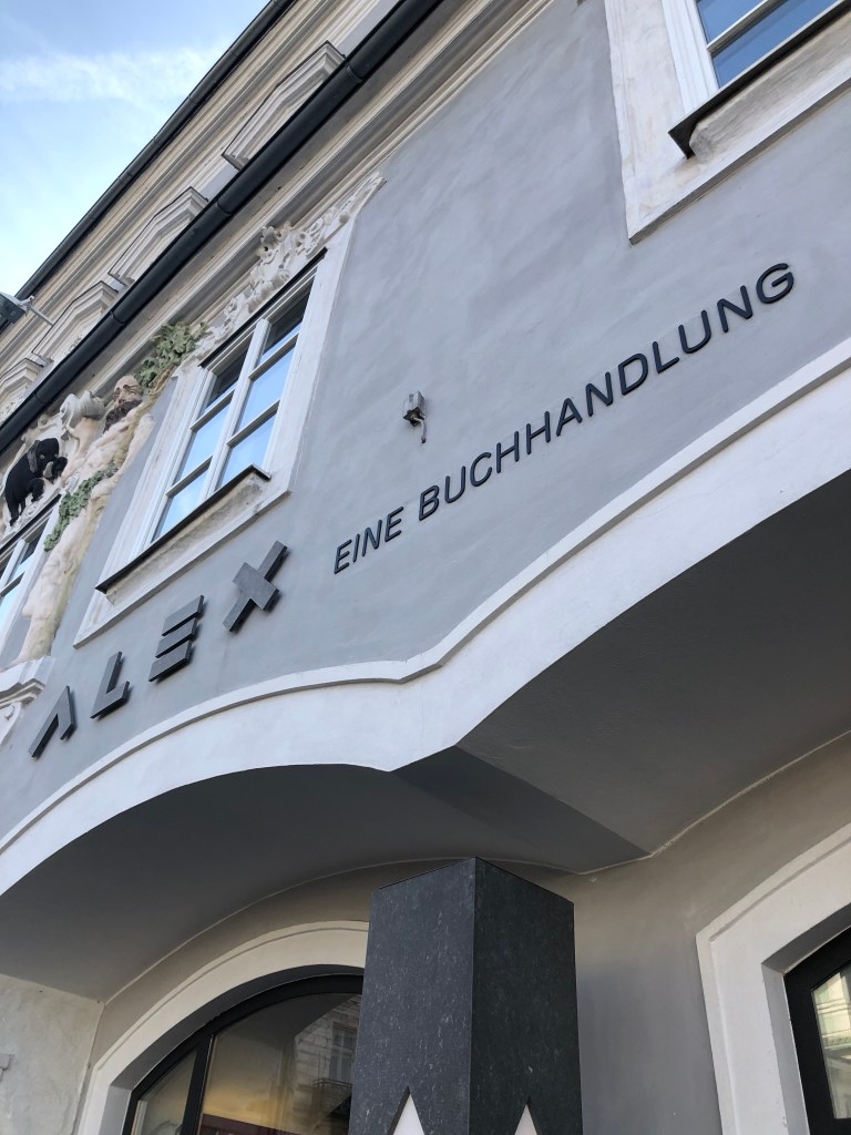 Nun ja. Ich schlendere weiter an der frischen Luft und biege in ein Seitengässchen ein. Dekowaren aus dem Orient und schöne Spruchkarten. Der nette Verkäufer lässt mich in Ruhe schmökern und ich sehe wunderschöne filigrane Armbänder. Bei der Anprobe dieser scheitere ich exorbitant. Für welche Frauenarme sind die wohl gemacht? Für Kinder? Um nicht unhöflich zu sein, kaufe ich dem Herren an der Theke etwas ab. Spruchkarten. Große Liebe: Spruchkarten. Wieder auf dem Bürgersteig zieht es mich in die Herrenstraße. Kein Mensch weiß, warum, aber ich hab da irgendwas in einem Schaufenster entdeckt, das mich sehr angesprochen hat. Nein, keine Spruchkarten – aber Sprüche! Sprüche in der Schaufensterdeko. Ich habe vergessen, sie zu fotografieren. Und mein Mann ist ja noch in seinem Termin. Ein wenig stolz bin ich schon auf mich, ich habe auf Anhieb diese Herrenstraße gefunden. Frau hat gut aufgepasst bei der Stadtführung. Nachdem ich mit meinem Handy die Sprüche im Schaufenster festgehalten habe (ohne die Preise zu beachten), ruft mein Mann an. Wir vereinbaren ein Treffen in einem Kaffeehaus am Hauptplatz. Ich weiß auch gleich, wie ich da jetzt wieder hinkomme und marschiere los. Kurz bevor ich dieses Café erreiche, erspähe ich einen kleinen feinen Buchladen. Gibt es was Schöneres wie einen Buchladen? Ich meine nicht die großen Buchläden von großen Handelsketten, nein, ich meine kleine Buchläden, wo der Buchhändler die Leute mit Namen anspricht und ein Schwätzchen mit den Kunden hält.