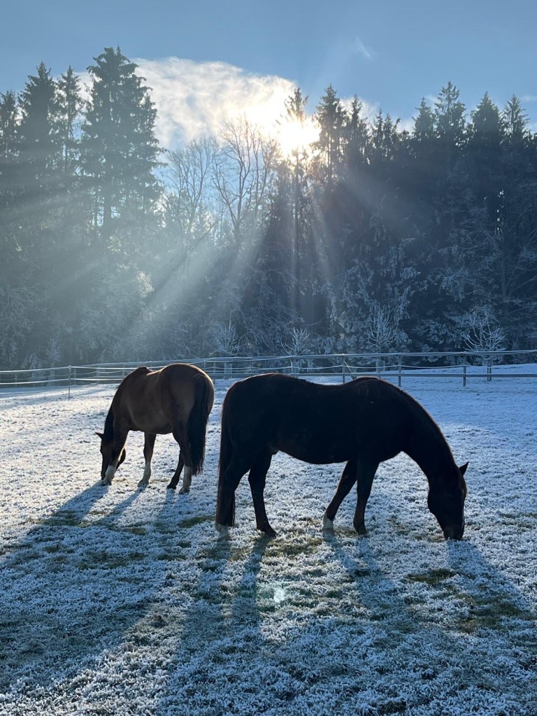 In der Früh bei der Stallarbeit der Geruch der Pferde, das Erdige, das Vertraute, die Musik in meinen Ohren, wenn sie abschnauben und Heu mampfen. Das flauschig aufgestellte Winterfell, dick wie eine Daunendecke, in das man reinfallen möchte. Das knarzende Geräusch, wenn die starken Hufe über vereistes Gelände schreiten, scheinbar verwurzelt und doch schwerelos und ohne Hast. Ihr weiches Maul gräbt verschiedenste Kringelmuster in das vereiste Gras, unter der Raureifdecke finden unsere Pferde letztes zartes Grün. Ursprünglich, naturnahe, ihrer Wesensart entsprechend dürfen sie schier uneingeschränkt hier bei und mit uns leben.