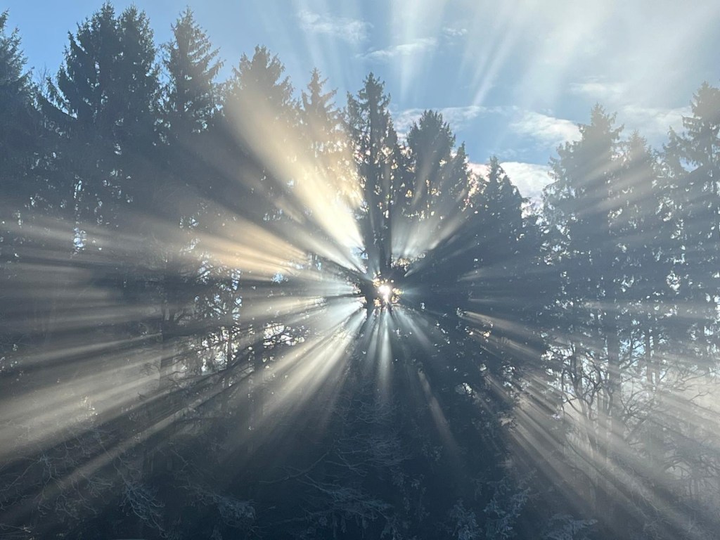Wir fühlen uns an Tagen wie diesen wie Waldbewohner, sind wir doch umgeben von einem prächtigen Wald, in den man stundenlang bei Spaziergängen eintauchen kann, Erholung, Entschleunigung für Geist und Seele. Der Reif schwebt nach einem kurzen Windhauch lautlos auf die Wege, tausende weiße Kristalle hängen an den Zweigen, wenn sich die Sonne an dieser Symphonie noch beteiligt, glitzern viele bunte unterschiedliche Farbnuancen auf. Ein stilles Orchester der Natur.
