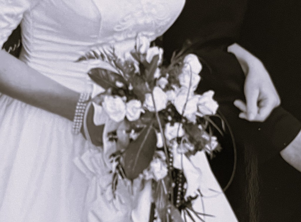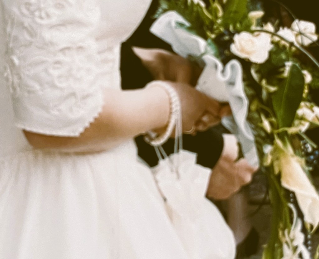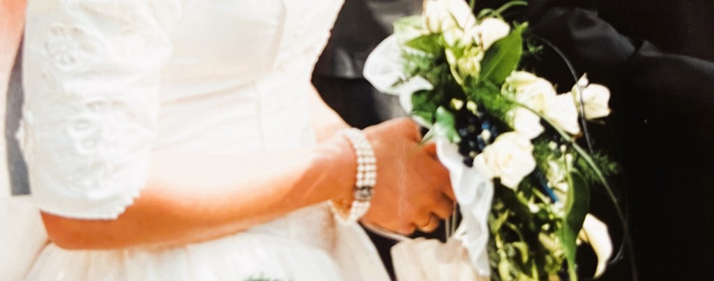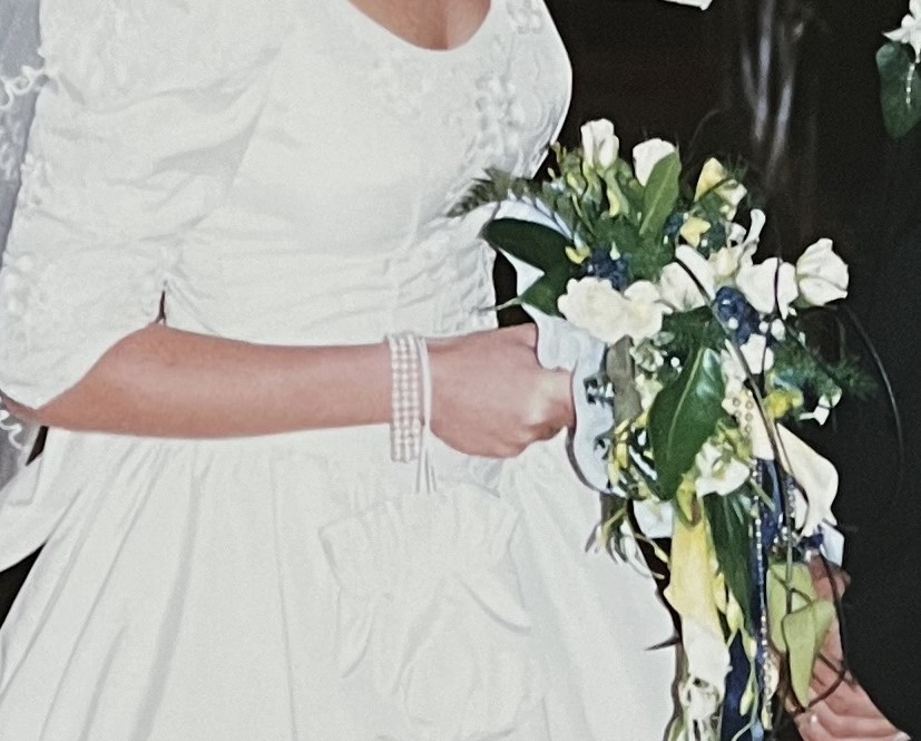 Die Perlen an meinem Handgelenk, ein Geschenk meiner Mutter zur Hochzeit, haben Glück gebracht. Im Jahr 2025 sind wir dreißig Jahre verheiratet und feiern Perlenhochzeit.